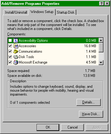 1) Go to START -- Settings -- Control Panel 2) Double Click on Add/Remove Programs3) Click on the Windows Setup Tab 4) The following screen should appear