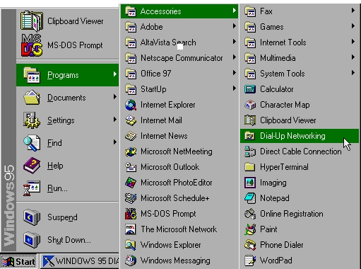 7) Make sure the box in front of Dial-Up Networking is checked by clicking on it.8) Click OK9) If you are using the Windows 95 CD, Setup will prompt you to insert it in the drive (if the CD is already in the Drive or if the system files are stored on the hard disk, the installation will proceed automatically. If you installed from diskettes, you will be prompted for the appropriate Windows 95 Installation Diskette to insert and then continue.10) Windows will copy some files and update desktop Shortcuts. A Dial-Up Networking folder will appear under the Start Menu:Programs\Accessories\Dialup Networking.DID IT WORK??To confirm that Dial-Up Networking has been properly installed, click on your Start Menu and look for it. You should see the DUN folder under Accessories, as below:![]()