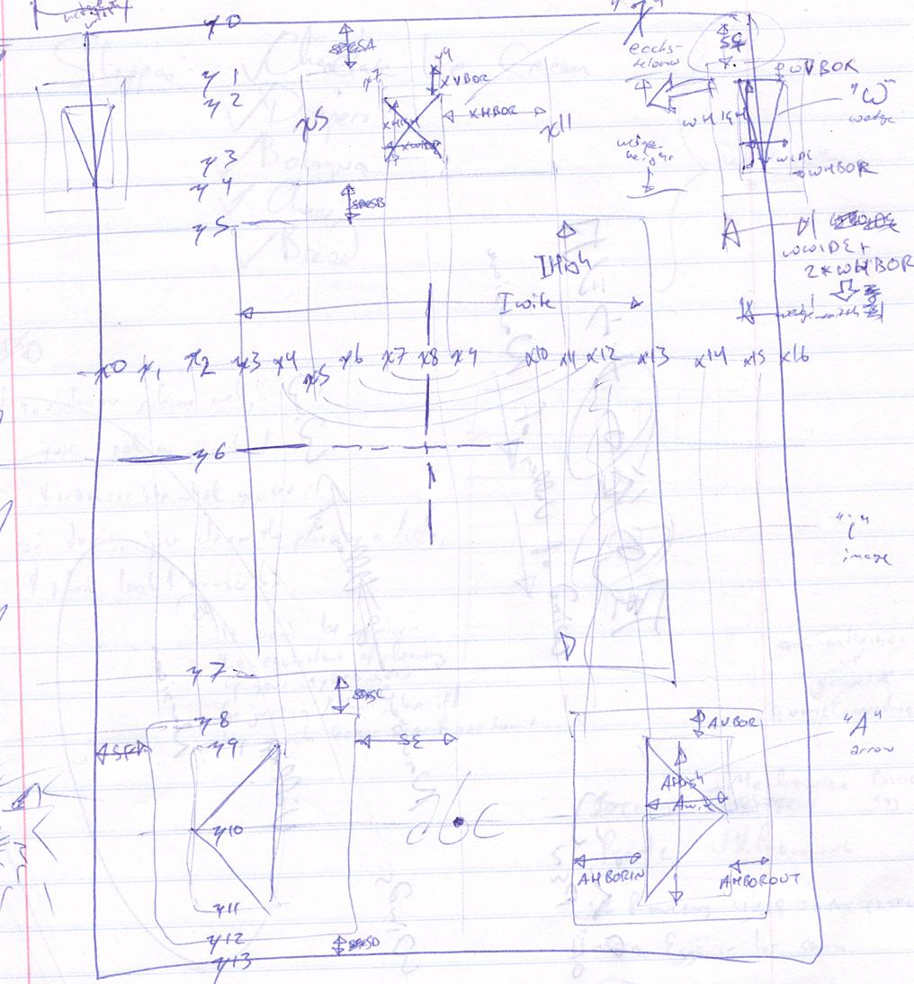 After the sizes, dimensions, and spacings were determined, I converted them to coordinates. Why the two step process? Why not just start with purely physical coordinates? It is easy to manipulate logical coordinates, but interrelated physical coordinates are difficult to deal with. I would rather tweak logical coordinates, and have the physical coordinates automatically calculated.
